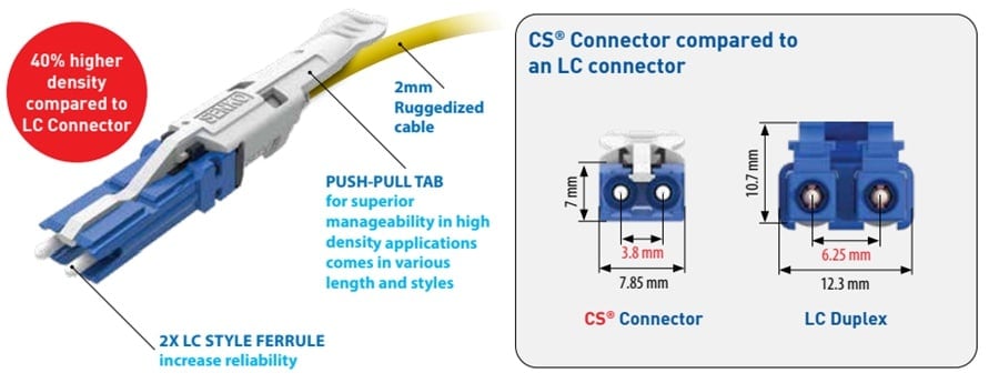 The CS connector has higher density and durability than LC and SC connectors. It is a good choice if you need a rugged, space-saving optical fiber connection.